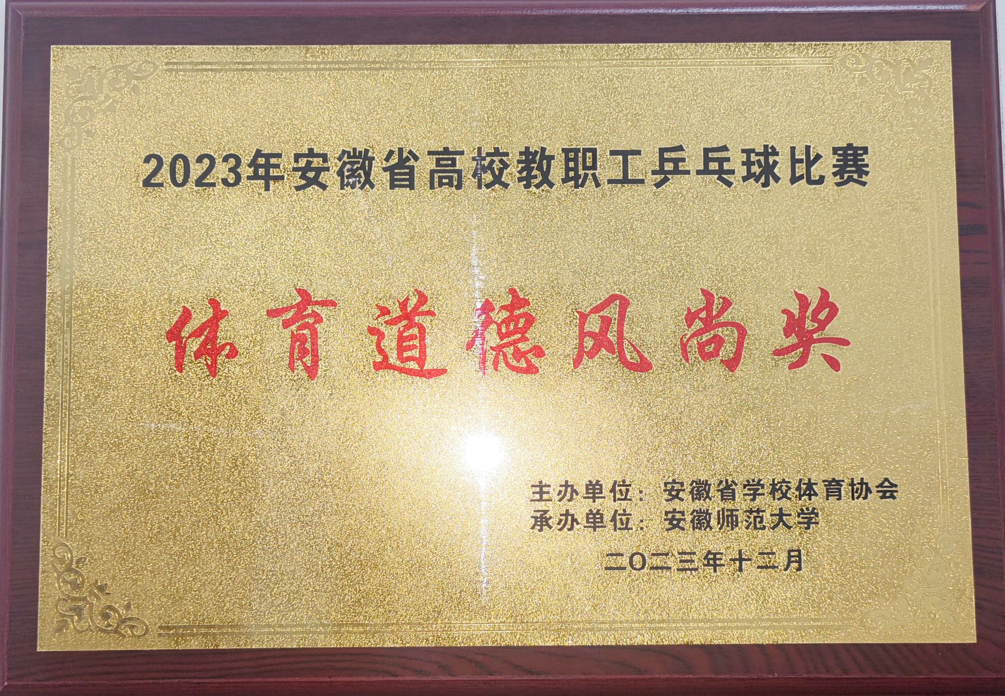 12月10日,由安徽省学校体育协会主办,安徽师范大学承办,安徽省乒乓球运动协会协办的“2023年安徽省高校教职工乒乓球比赛”在安徽师范大学花津校区顺利落下帷幕。本次比赛省内共有四十二支队伍、两百余名运动员参加,我校教职工乒乓球队在学校副校长戴敏的带领下,参加了本次比赛,经过两天紧张激烈的比拼,我校教职工乒乓球队荣获“体育道德风尚奖”和团体亚军的好成绩。